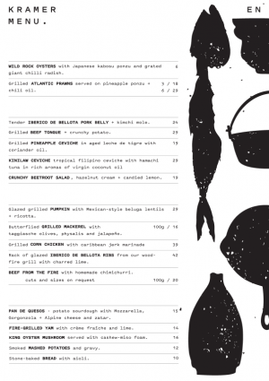 At Kramer, artists have shaped a restaurant venue of unparalleled atmosphere: explosive taste sensations, the thunderous crackle of a live wood fire, driving music, and one-of-a-kind ceramic bowls—crafted by Fabian Kramer himself in the restaurant’s own on-site studio—whose primal, tactile shapes deepen the very essence of the fire-kissed dishes.